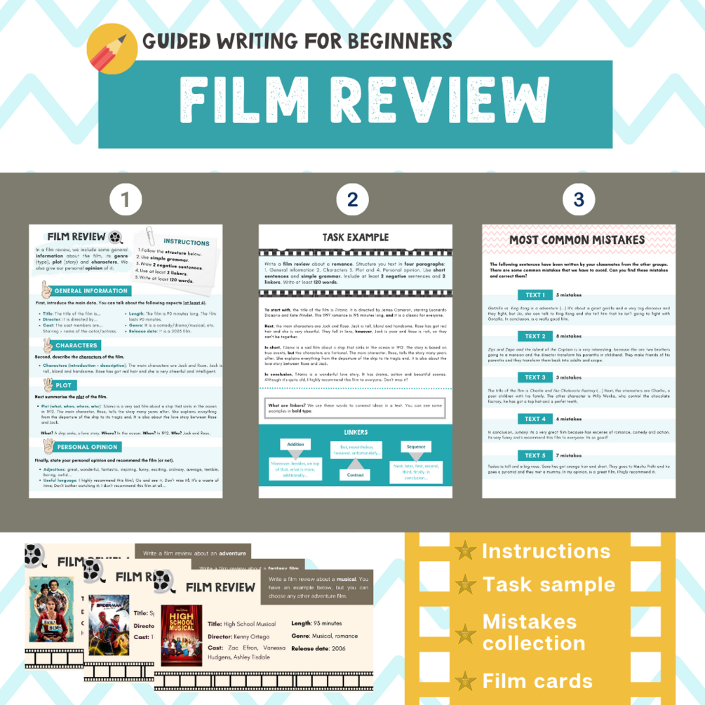 - Las instrucciones explican paso a paso cómo redactar la film review, con ejemplos y expresiones útiles. También incluye un ejemplo y una tabla de conectores.